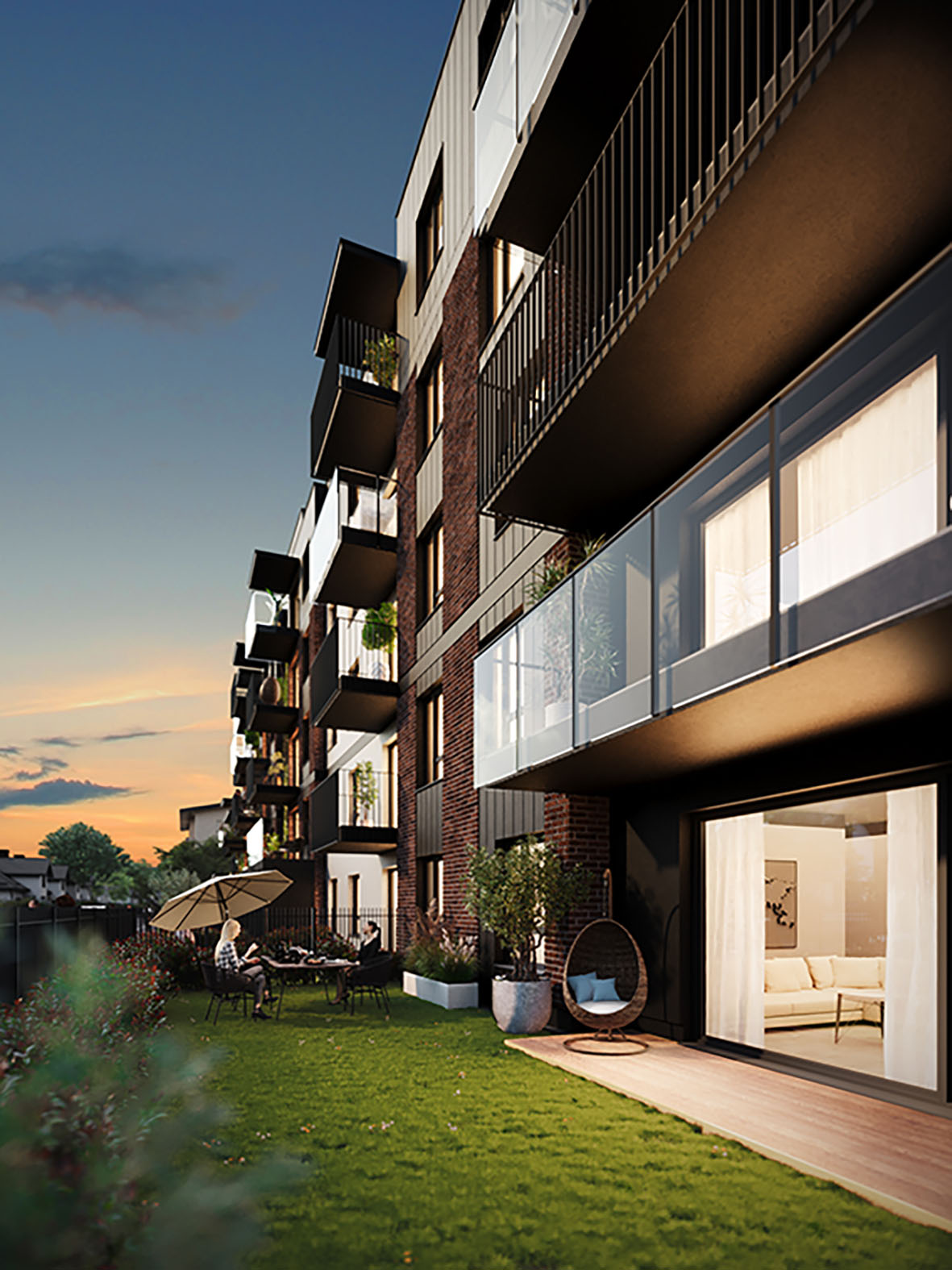 Prywatne ogrody zapewniają przestrzeń na relaks, spotkania w gronie znajomych oraz zabawę dla dzieci.